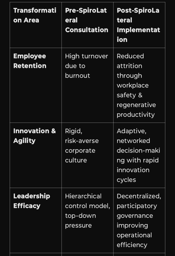 The 21st-century corporation must evolve beyond coercion-based, extractive business models. SpiroLateral provides the blueprint for companies to thrive in an era of regenerative economics, decentralized governance, and nervous system-informed leadership.