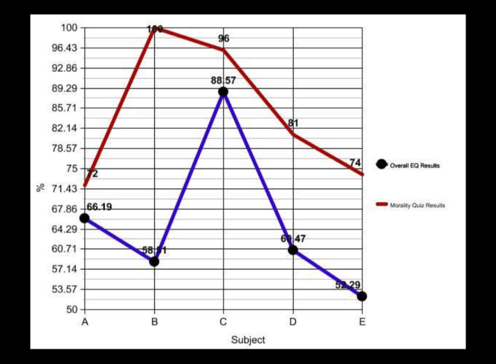 A conscious attempt was made to get a wide range of ages and genders for demographic sampling. Subjects A and B are both people that I met online and have a casual acquaintance with. Subject C is my caregiver. Subject D is a friend of mine, and Subject E is a classmate. None of the participants received any financial compensation or incentives in order to participate in this study. It is important to note that they may have been more willing to share deeply personal details because of an existing relationship with me prior to this study. In order to minimize harm done to my subjects due to the sensitive topics discussed in our interviews, I attempted to remain both nonjudgmental and empathetic while gathering my data. Because this research relies solely on oral reports, the participants’ own personal bias may have been unintentionally introduced, and therefore it is recommended to perform further in depth longitudinal research in this area in order to more fully understand the dynamics of socio-emotional development and the impact that both parenting styles and the communication styles experienced in child have on adult mental health. Before the interview, the participants were asked to complete two online quizzes that measured their levels of emotional intelligence and morality. Given the relatively small sample size, a larger study could be justified through the results that were obtained here.