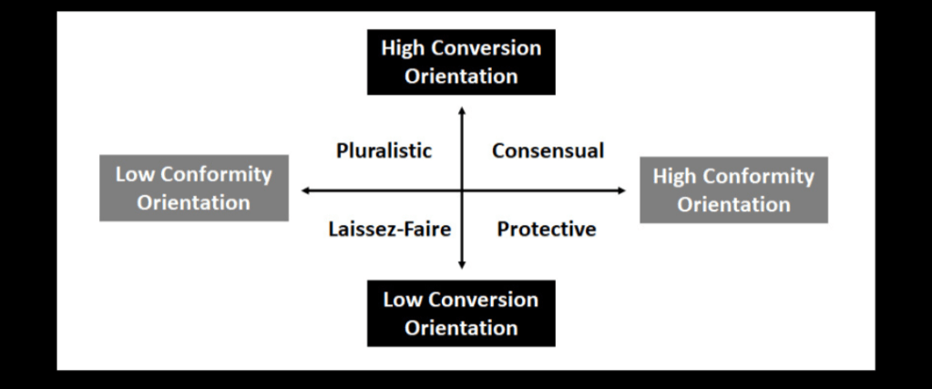 Family Communications Theory (Model A) was developed by Ascan F. Koerner and Mary Anne Fitzpatrick (2002). It views the family as a social system, and divides these family systems into categories of communication through four distinct patterns. The four family communication patterns are consensual (high conversation, high conformity), protective (low conversation, high conformity), pluralistic (high conversation, low conformity), and laissez-faire (low conversation, low conformity). Families with high levels of conformity produce children who have a fewer number of interpersonal skills in their adult relationships (Koesten, 2004), are conflict avoidant, and tend to be more hierarchical, with a clear sense that some members have more authority than others (Alder and Proctor, 2017). Families with low conversation orientations interact less and are more emotionally distant. Conflict tends to be avoided in these families, and they are characterized by power plays and refusal to have an open dialogue. In protective families (low conversation, high conformity), obedience to authority is emphasized. Protective family members typically scored low on communication skills (Samek and Reuter, 2012). Pluralistic families produce offspring that are less verbally aggressive than any other type (Schrodt and Carr, 2012). In pluralistic families, all family members’ contributions are valued and evaluated on their own merits. Studies have shown that in addition to the association between communication and family closeness (Schrodt, 2006; Vazsonyi, Hibbert & Snider, 2003) FCT communication patterns are also associated with the amount and quality of of intimacy shared in close adult relationships following childhood (Ledbetter, 2009). Pluralistic families tend to be more securely attached, and utilize supportive discipline methods. The other three types of patterns tend to result in more insecurely attached family members. Based on the results of the field experiment here, as well as in previous studies that show a direct link between low conformity and low aggression (Schrodt and Carr, 2012), pluralistic patterns are the optimal and ideal FCT category.