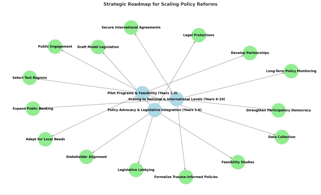 This strategic roadmap provides a structured pathway to scaling transformative policies worldwide. By starting with pilot programs, securing legislative support, expanding internationally, and mitigating risks, we can establish a sustainable, cooperative, and trauma-informed future.