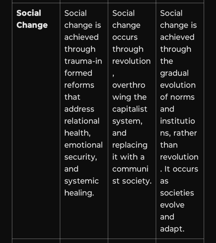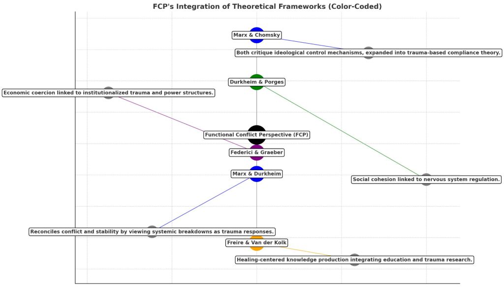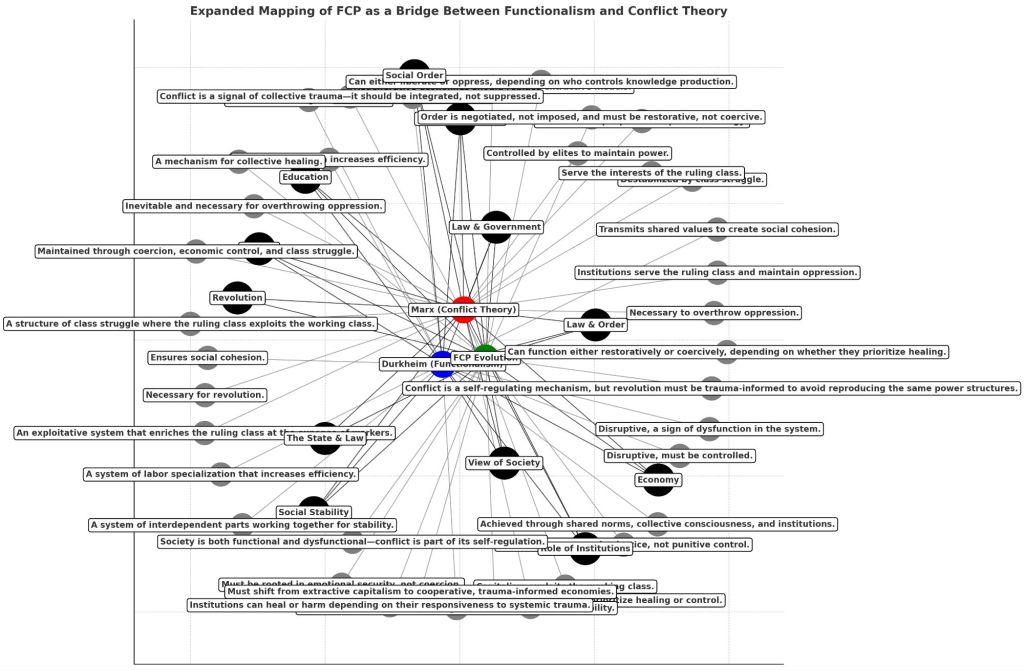 FCP integrates Conflict Theory’s focus on the structural nature of oppression and Marx’s theory of class struggle, arguing that societal conflict arises from the systemic and structural inequalities embedded in the social system. However, unlike traditional Conflict Theory, which posits that revolution is necessary to overthrow oppression, FCP suggests that systems must engage in trauma-informed reform that prioritizes relational health, emotional security, and justice.