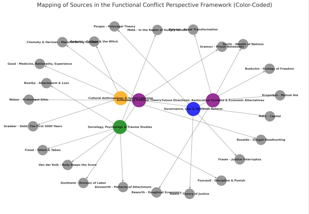 This annotated bibliography integrates foundational texts from Marxist economics, functionalist sociology, trauma research, governance theory, and anthropology, forming the intellectual backbone of Functional Conflict Perspective (FCP). Each source contributes to FCP’s argument that systemic dysfunction is rooted in trauma and must be addressed through restorative, non-coercive social structures.
