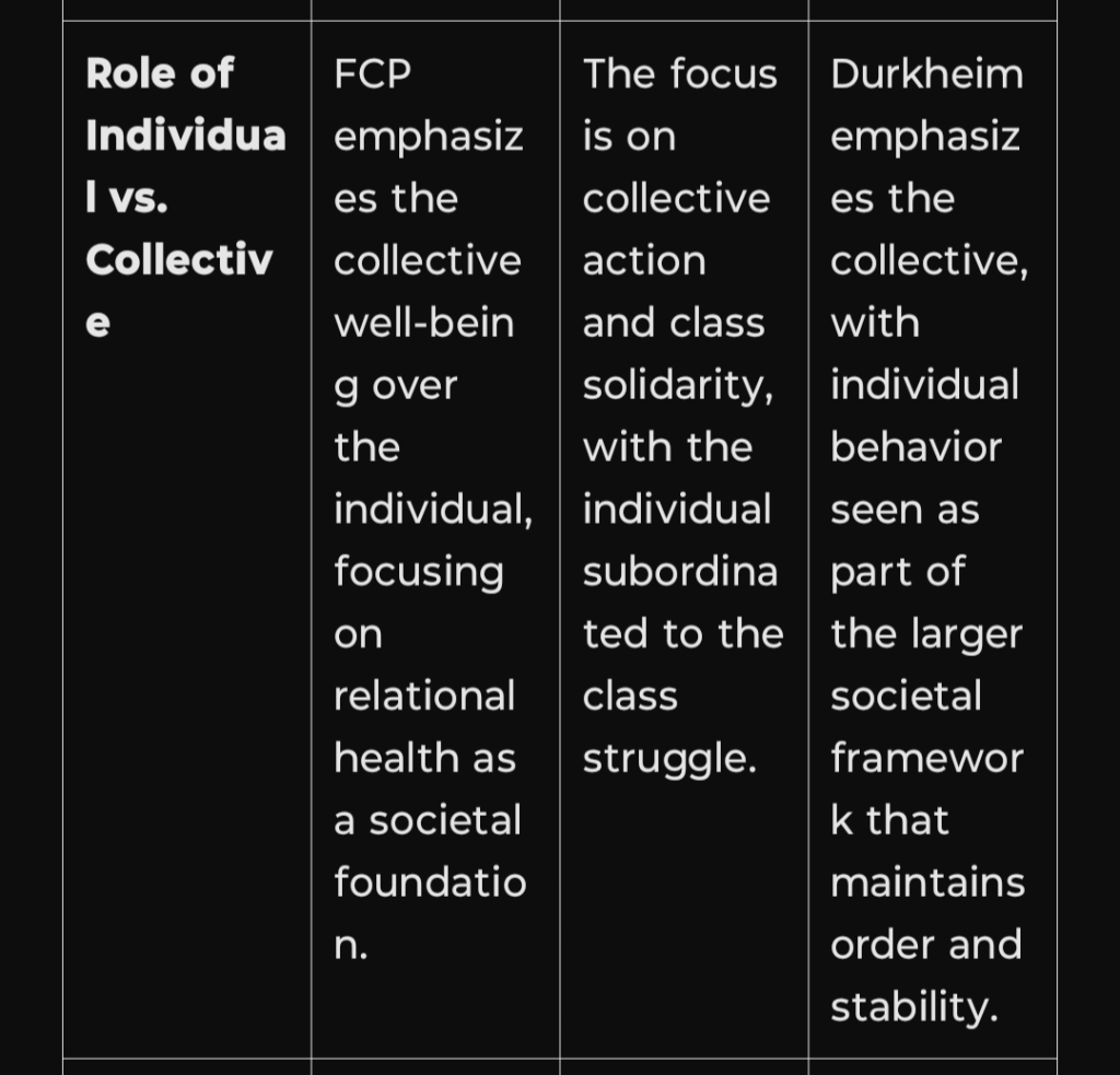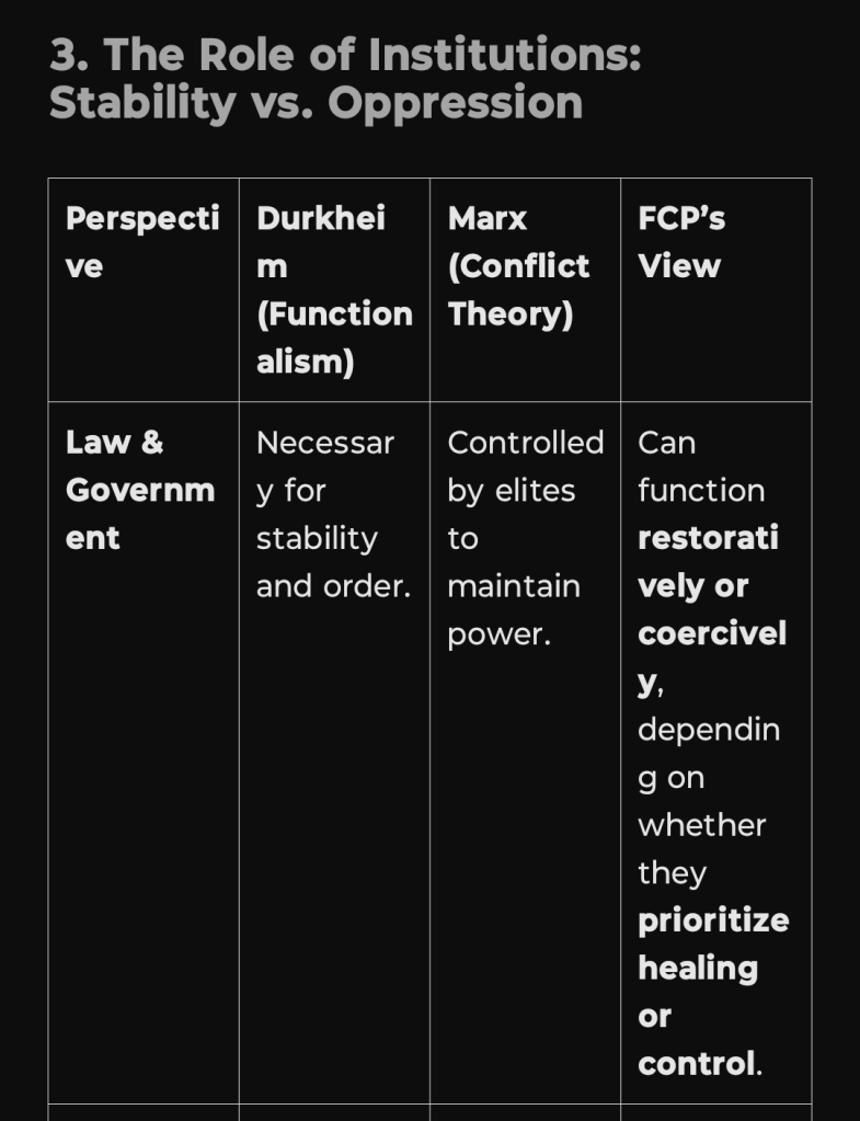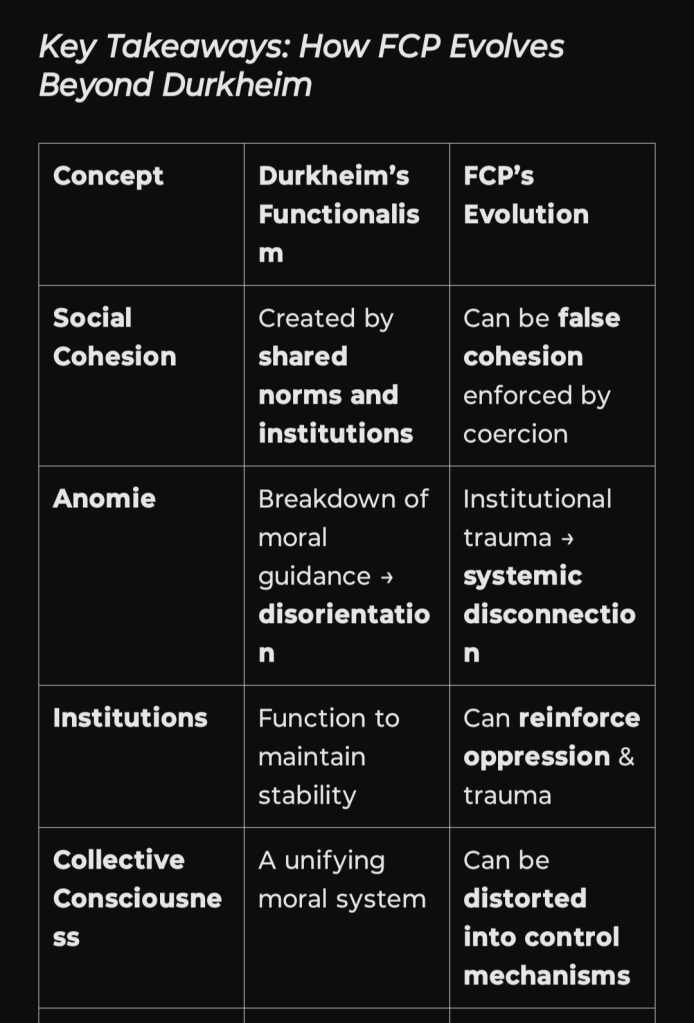 Durkheim argues that social cohesion is maintained through institutional structures. FCP critiques this by examining when institutions reinforce oppression instead of stability, blending Durkheim’s insights with trauma-informed systemic repair.