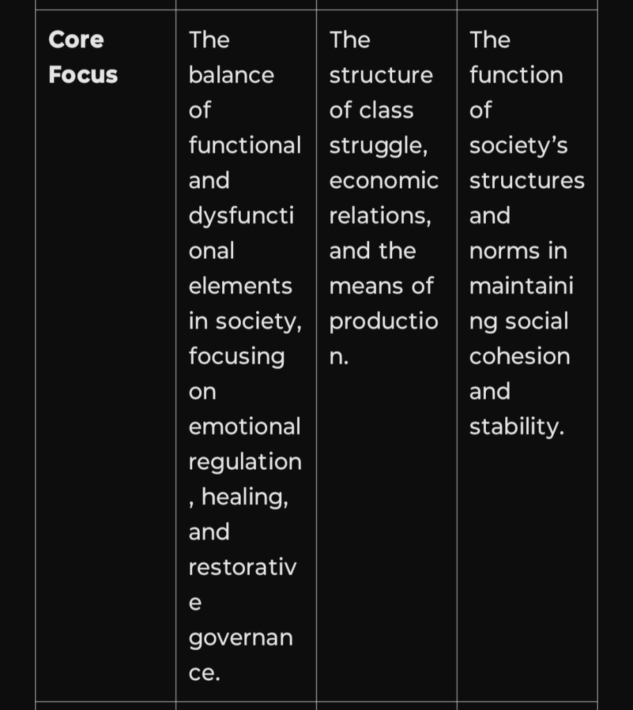 Functionalism, Conflict Theory, Trauma Theory, and Restorative Governance