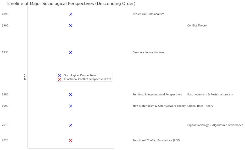 Functional Conflict Perspective (FCP) integrates insights from structural functionalism, conflict theory, symbolic interactionism, postmodernism, intersectionality, critical race theory, new materialism, and digital sociology to create a unified, trauma-informed framework for analyzing society. Rather than viewing social structures as purely stabilizing (functionalism) or inherently oppressive (conflict theory), FCP argues that social conflict itself is a regulatory mechanism—one that can either reinforce or resolve systemic trauma depending on how it is managed. It reframes power struggles not as problems to eliminate but as signals of unresolved collective distress that must be processed through relational, adaptive structures rather than coercive control.