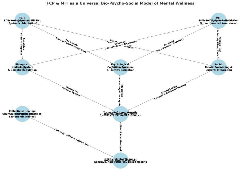 This map illustrates how FCP and MIT form a universal, cross-cultural approach to mental health by integrating biological regulation, psychological adaptation, and social healing into a flexible and trauma-informed framework.