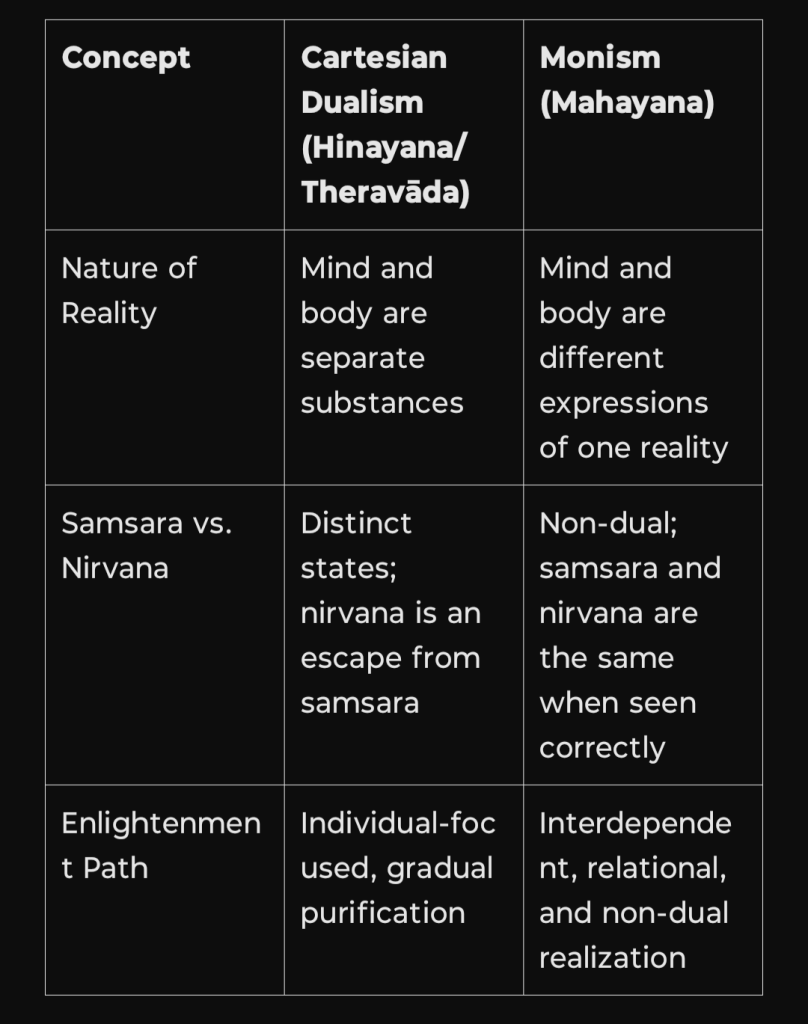 In contrast, Cartesian dualism insists that the mind is a distinct, immaterial substance that interacts with the body in some way, leading to ongoing debates about how such interaction occurs. There is a parallel between the Cartesian dualism vs. monism debate and the Hinayana vs. Mahayana distinction in Buddhist philosophy, though they are not identical.