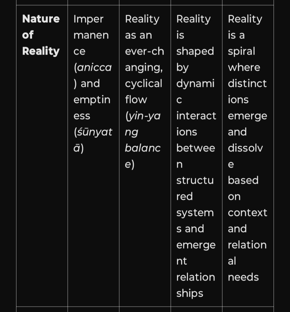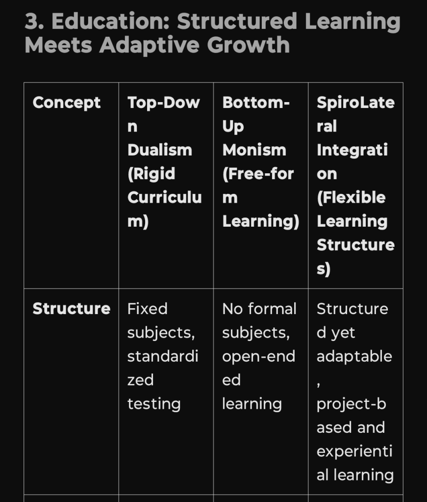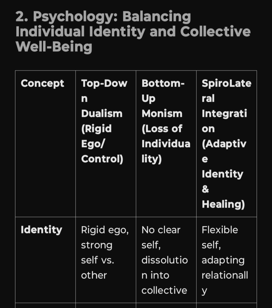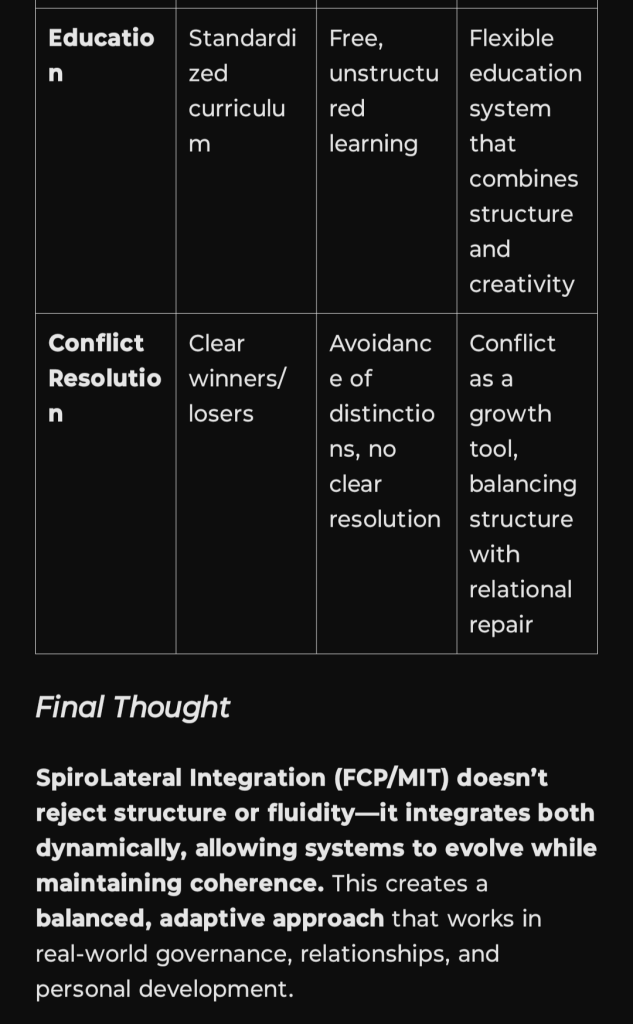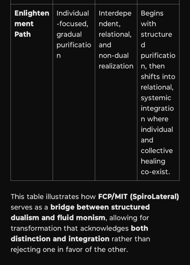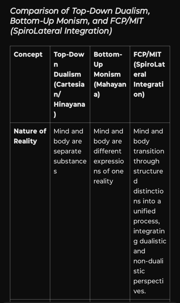 I’ve added FCP (Functional Conflict Perspective) and MIT (Mirror Integration Theory / SpiroLateral Integration) to the comparison table alongside Buddhism and Daoism. This table highlights how SpiroLateral functions as a bridge between structured dualism (Buddhism’s discipline) and fluid interconnection (Daoism’s effortless flow), integrating conflict resolution, relational adaptation, and systemic evolution: