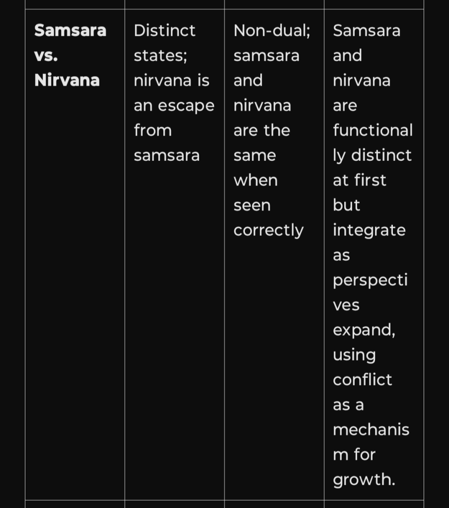 - Mahayana (Greater Vehicle), especially in schools like Madhyamaka (Nāgārjuna) and Yogācāra, challenges the rigid division between nirvana and samsara, proposing a more non-dual or monistic view.