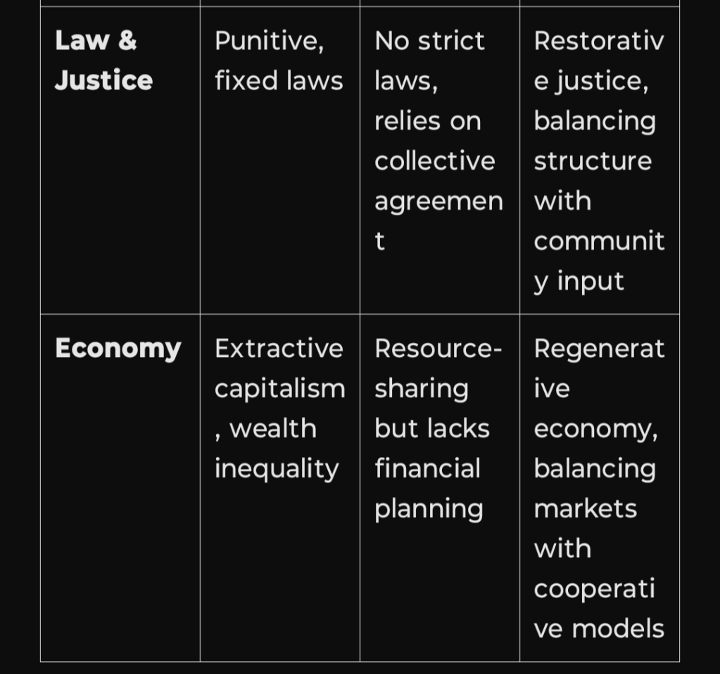 Example: Governance can be structured yet adaptive → restorative justice integrates rules with relational repair, rather than being purely punitive or purely permissive.