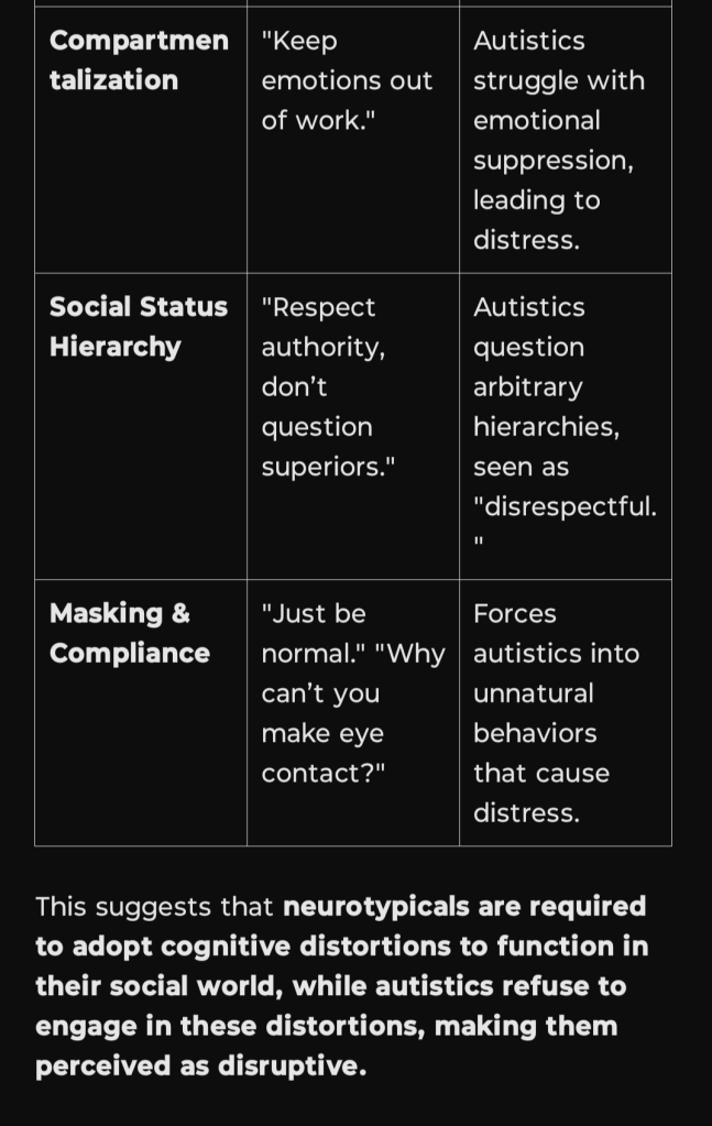 This directly connects to the Double Empathy Problem (DEP) in autism research, but it goes deeper: it reveals that neurotypicals are not just misunderstanding autistics, but actively enforcing a system that requires emotional detachment to function. This makes DEP not just a breakdown in communication but a structural form of gaslighting, where autistics are pathologized for not adhering to the cognitive distortions required to sustain hierarchical power structures.