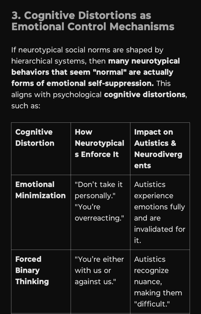 If neurotypical social norms are shaped by hierarchical systems, then many neurotypical behaviors that seem “normal” are actually forms of emotional self-suppression. This aligns with psychological cognitive distortions, such as: