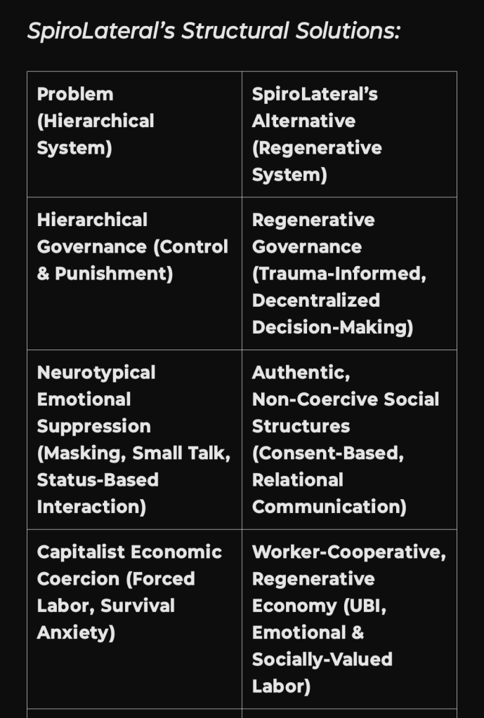 By rejecting rigid binaries (mind vs. body, self vs. other, neurotypical vs. autistic), SpiroLateral enables a non-dualistic, regenerative society.