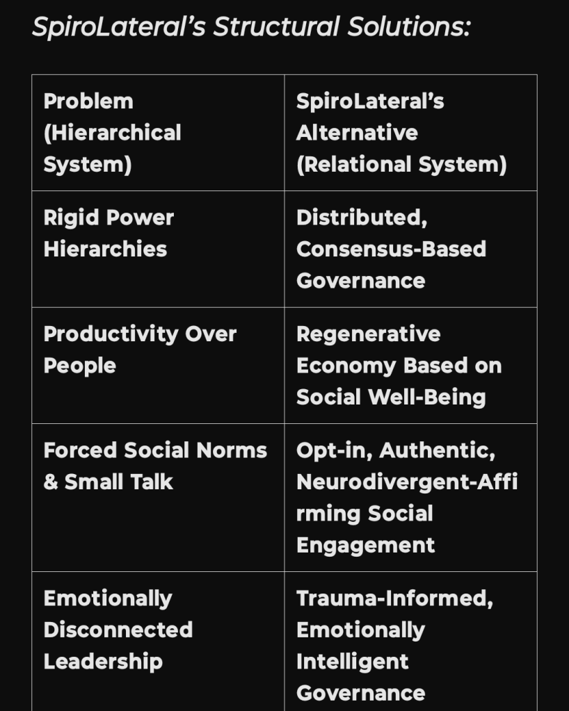 SpiroLateral’s approach to governance, economy, and education mirrors neurodivergent social models that emphasize mutual attunement, consent, and deep relationality.