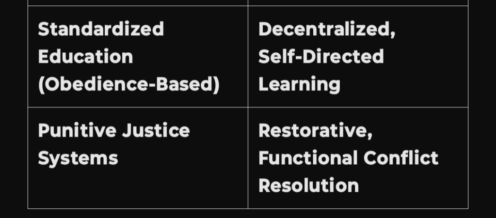 Decentralized learning replaces authoritarian schooling → Education becomes co-created, self-directed, and embedded in relational learning.