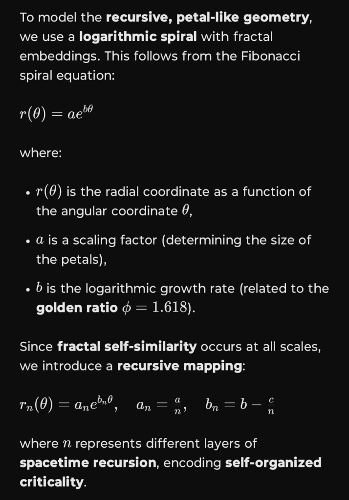 To model the recursive, petal-like geometry, we use a logarithmic spiral with fractal embeddings. This follows from the Fibonacci spiral equation: