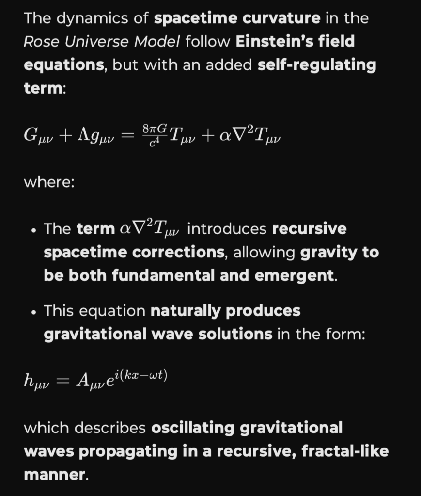 The dynamics of spacetime curvature in the Rose Universe Model follow Einstein’s field equations, but with an added self-regulating term: